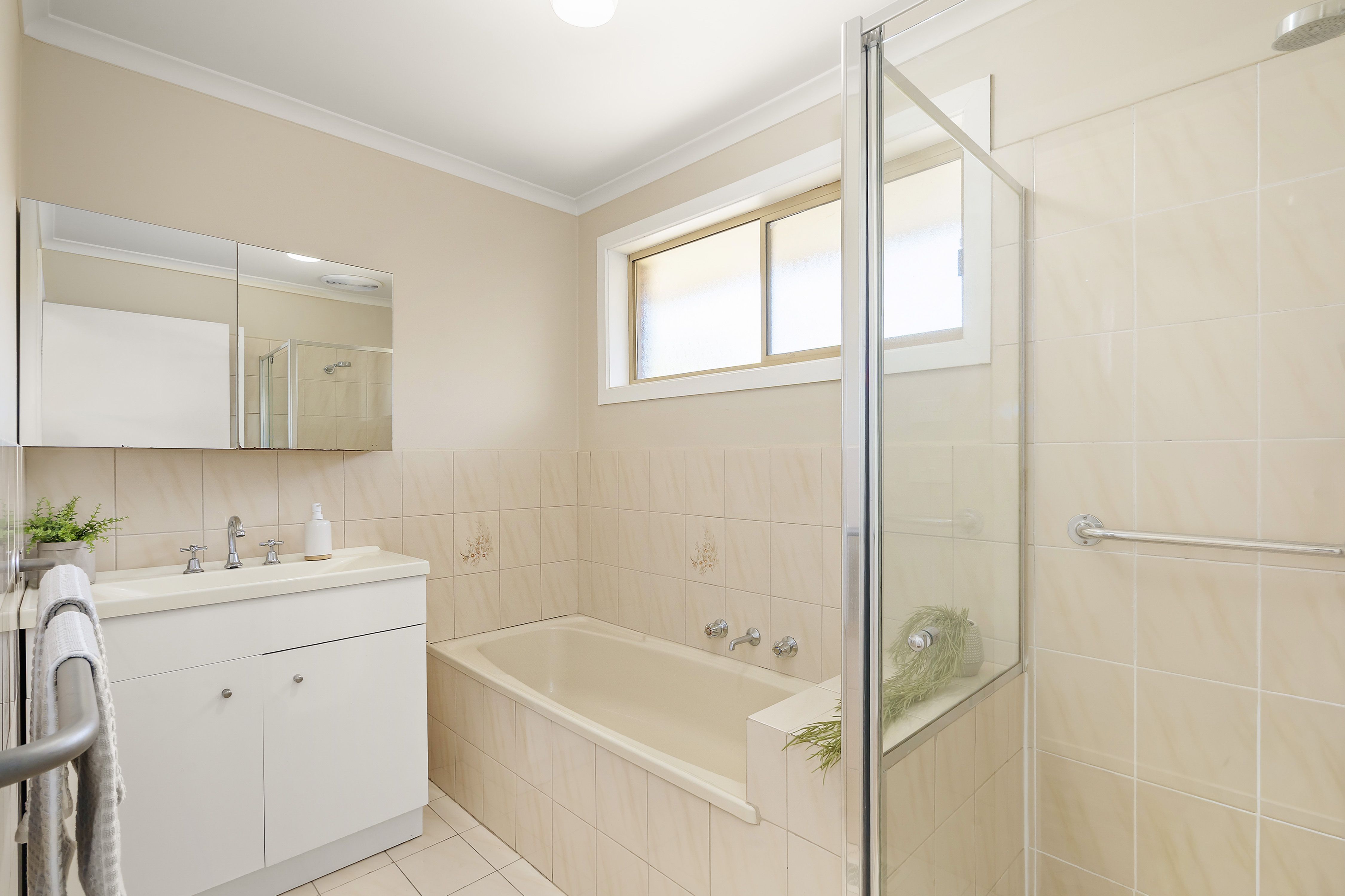 Both bedrooms are spacious and fitted with built-in robes, while the central bathroom includes a bathtub and separate shower. Additional highlights include a separate laundry and toilet, heating and cooling, and excellent storage throughout.