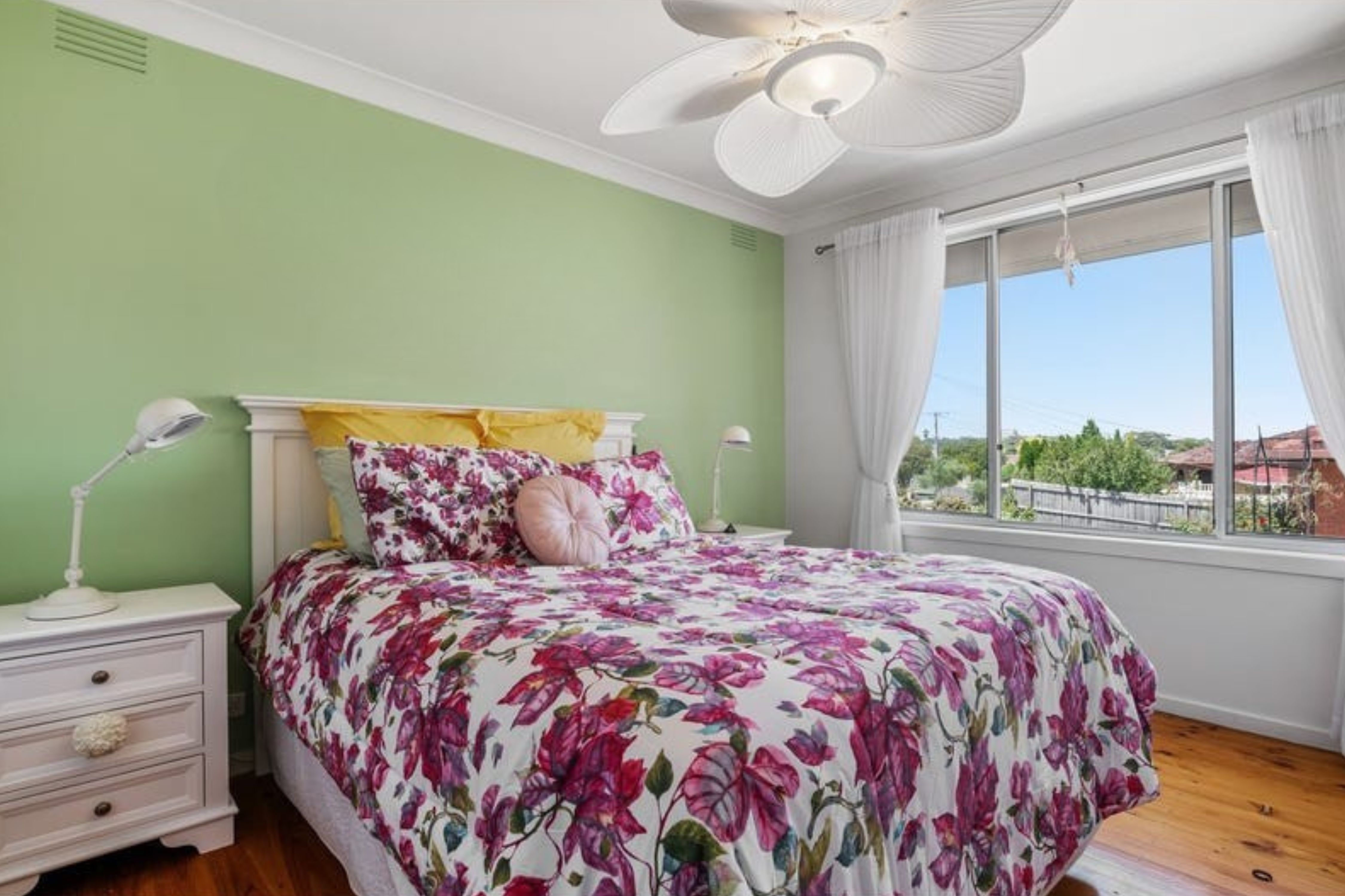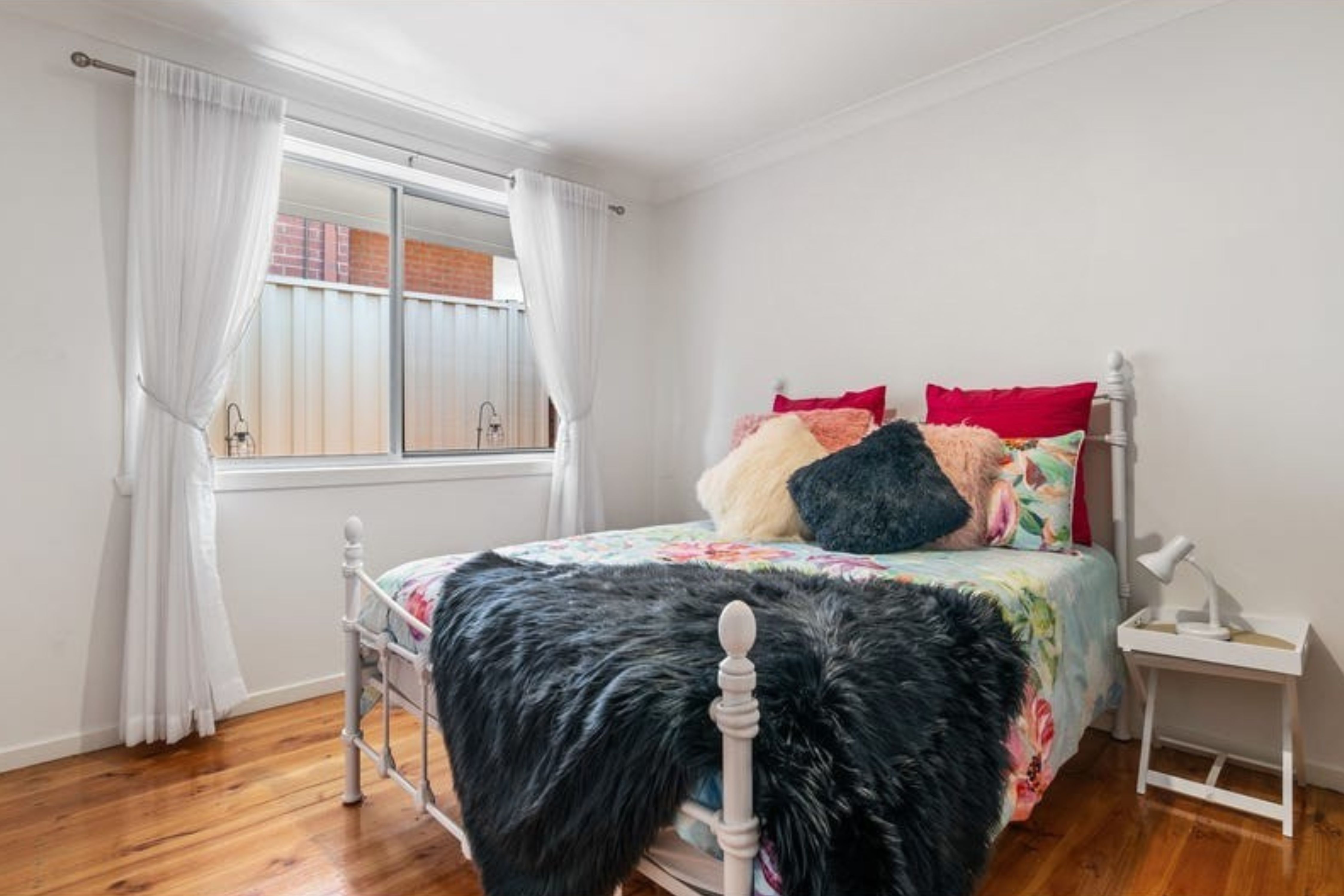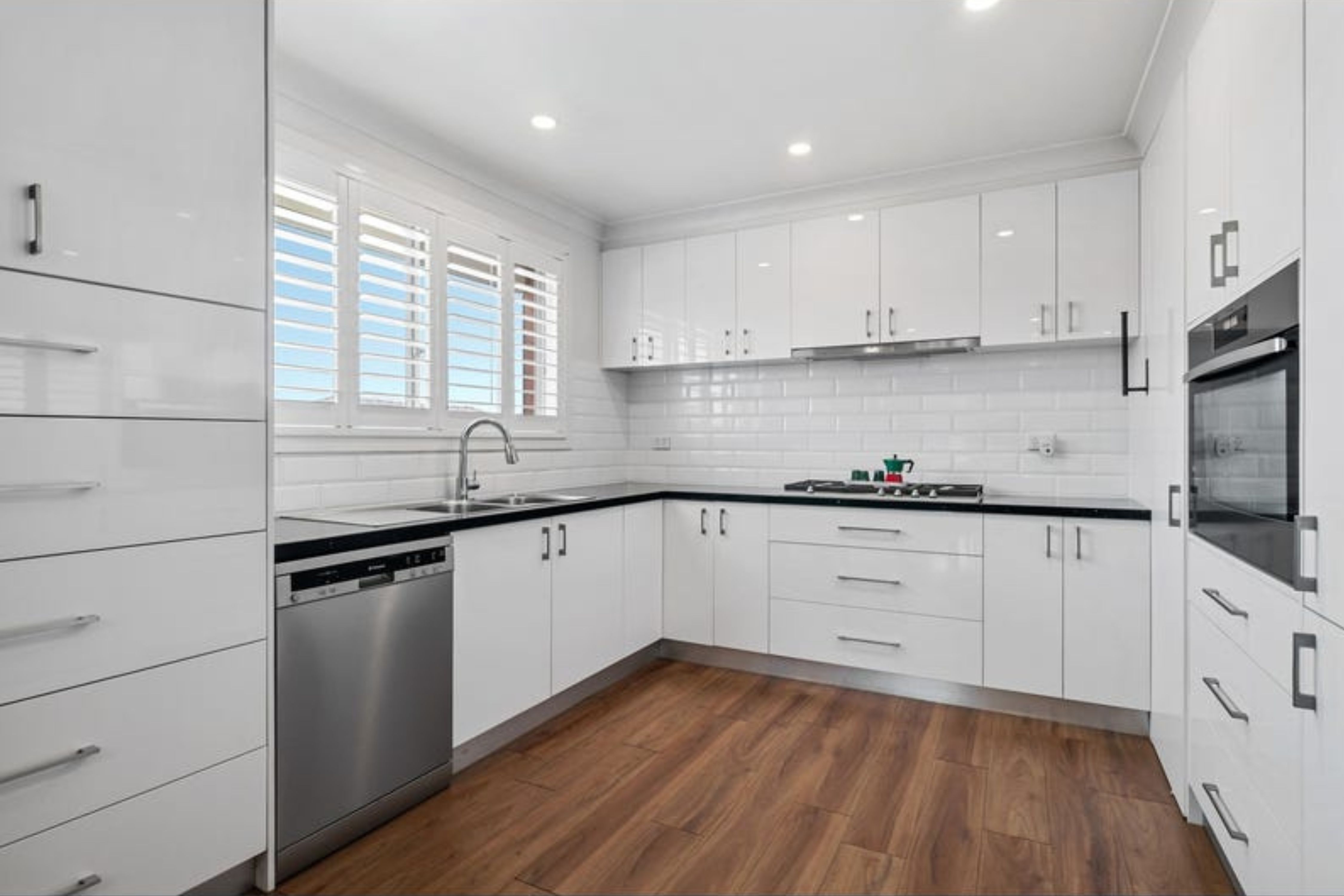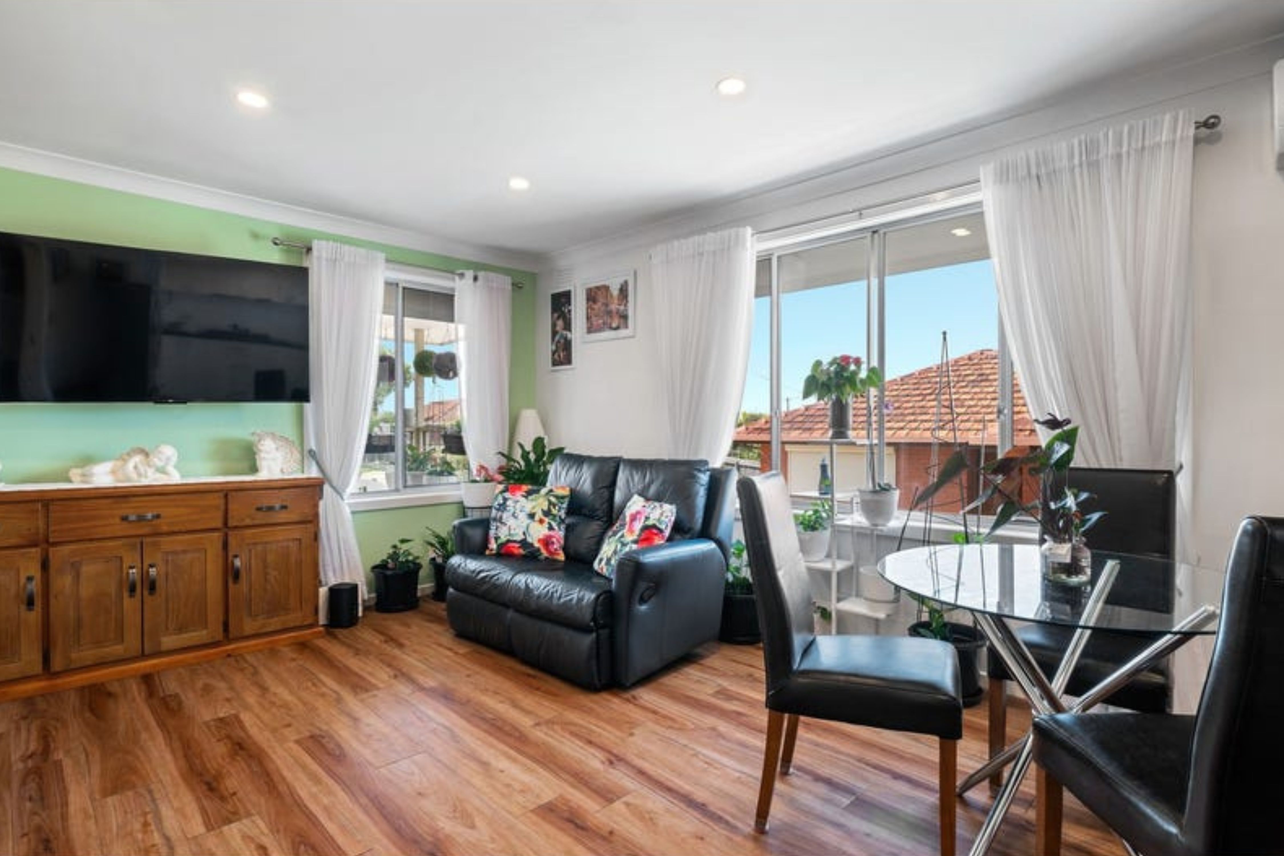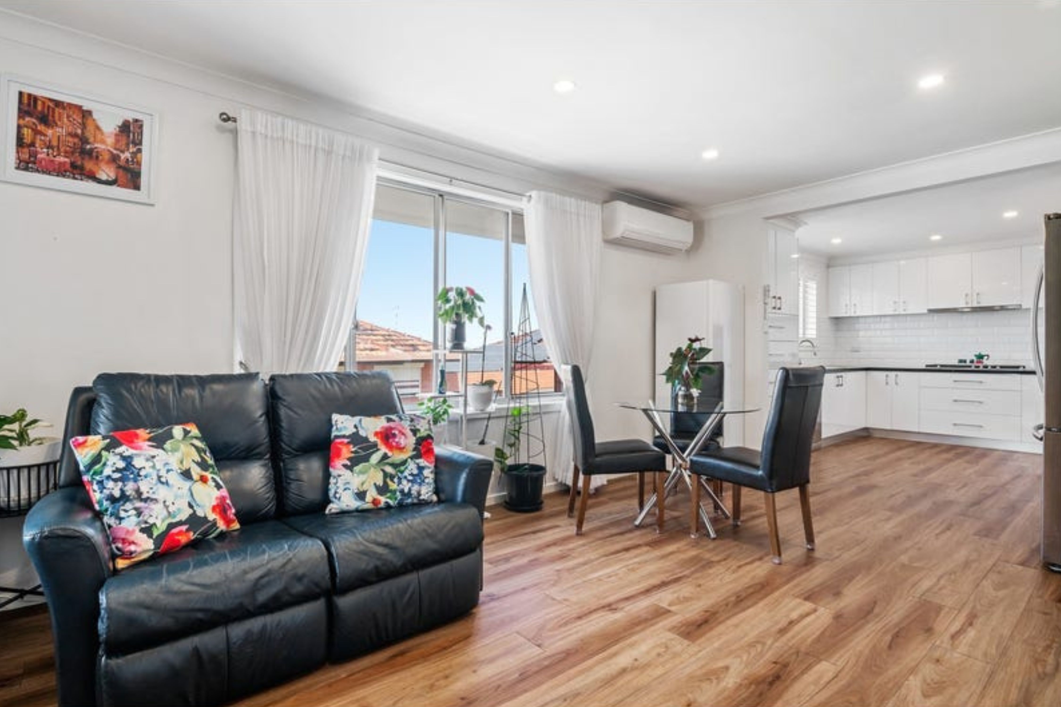 The home features floorboards throughout, enhancing the warmth of the space. The light-filled open plan living and dining area is perfect for both entertaining and everyday living, flowing effortlessly into the modern kitchen. The kitchen is equipped with a dishwasher, gas stovetop, inbuilt oven, and ample cupboard and bench top space.