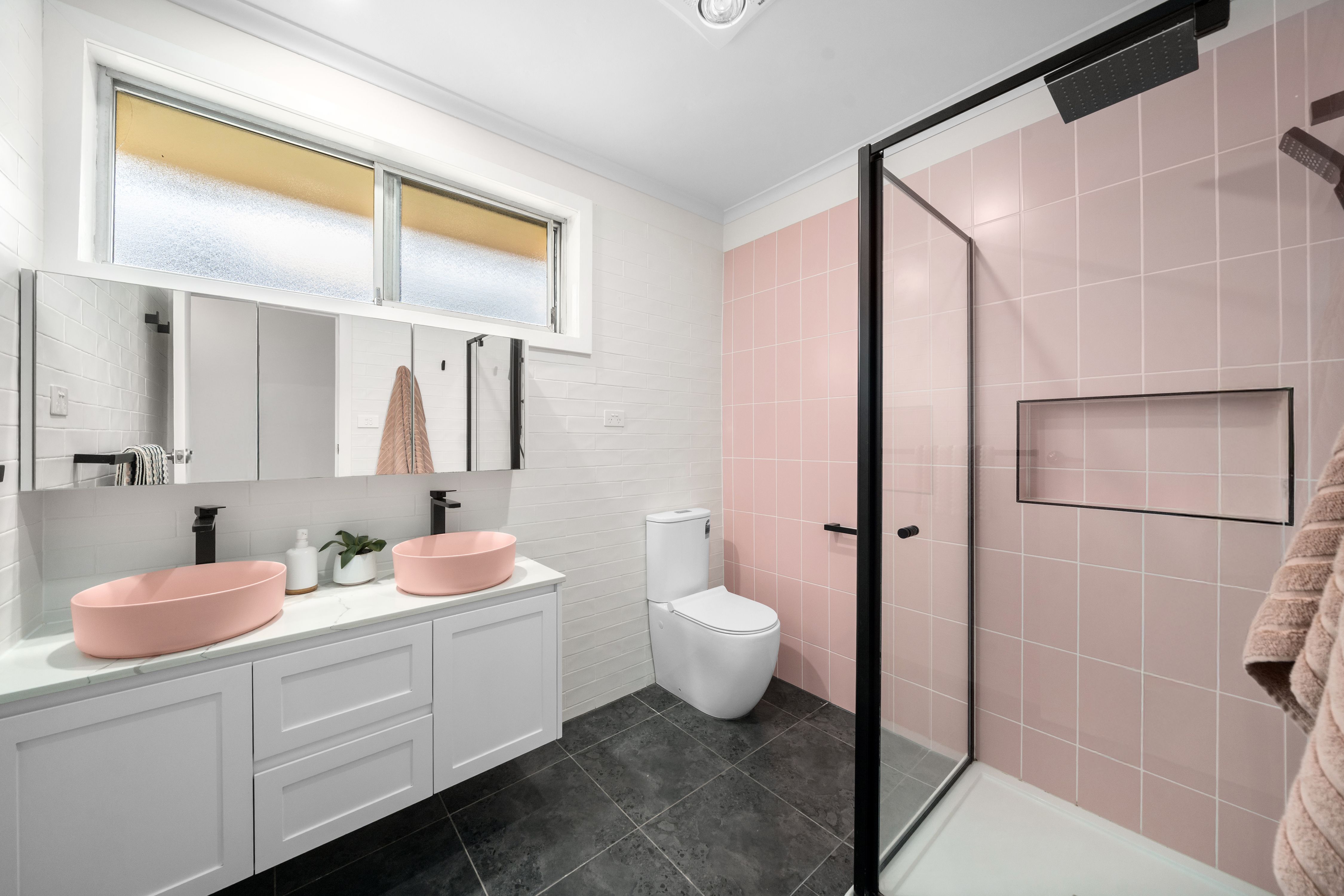 Three good-sized bedrooms are serviced by a brand-new bathroom showcasing double vanities, oversized framed shower and mirrored cabinetry. A second toilet and full laundry with easy outdoor access add extra everyday convenience.