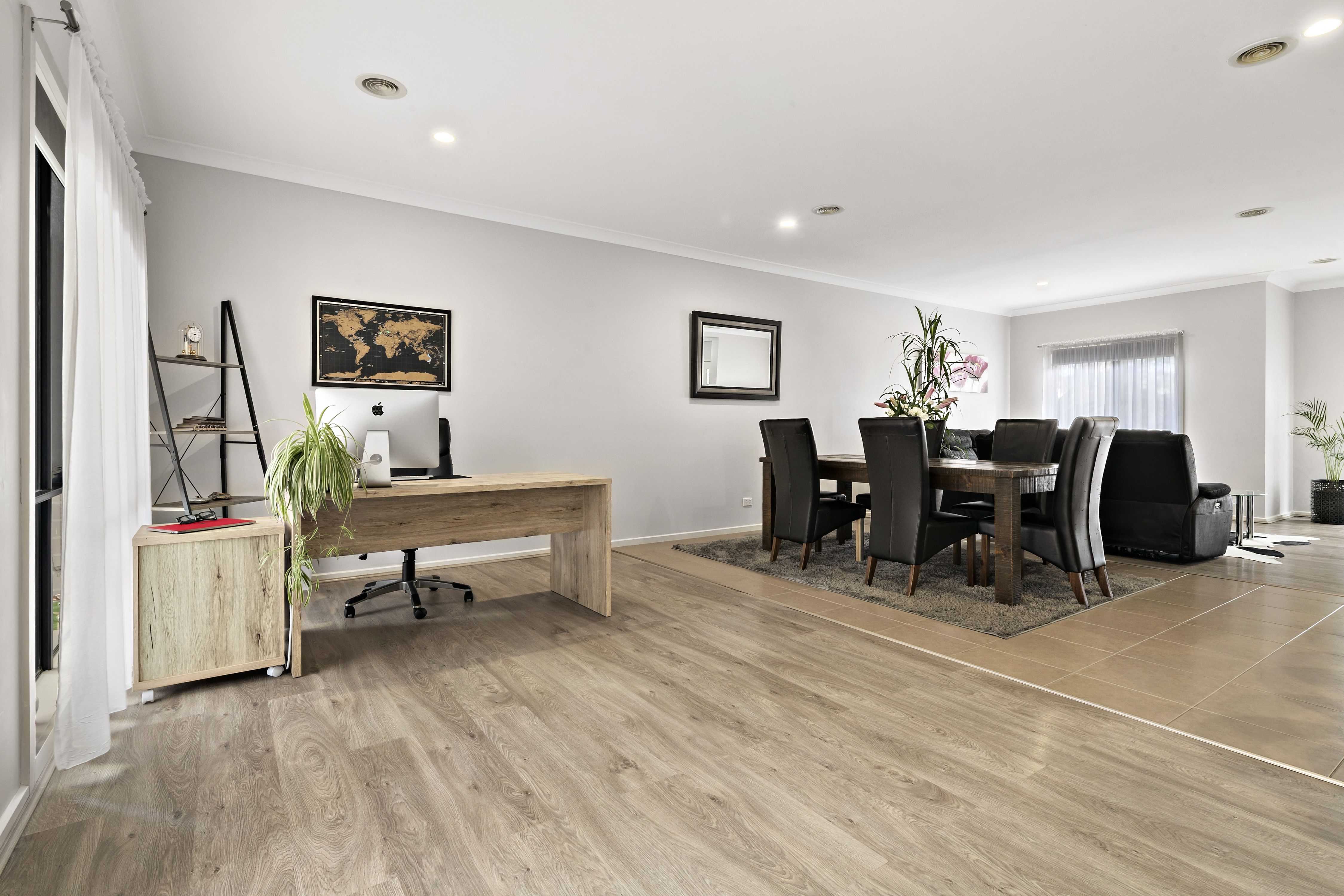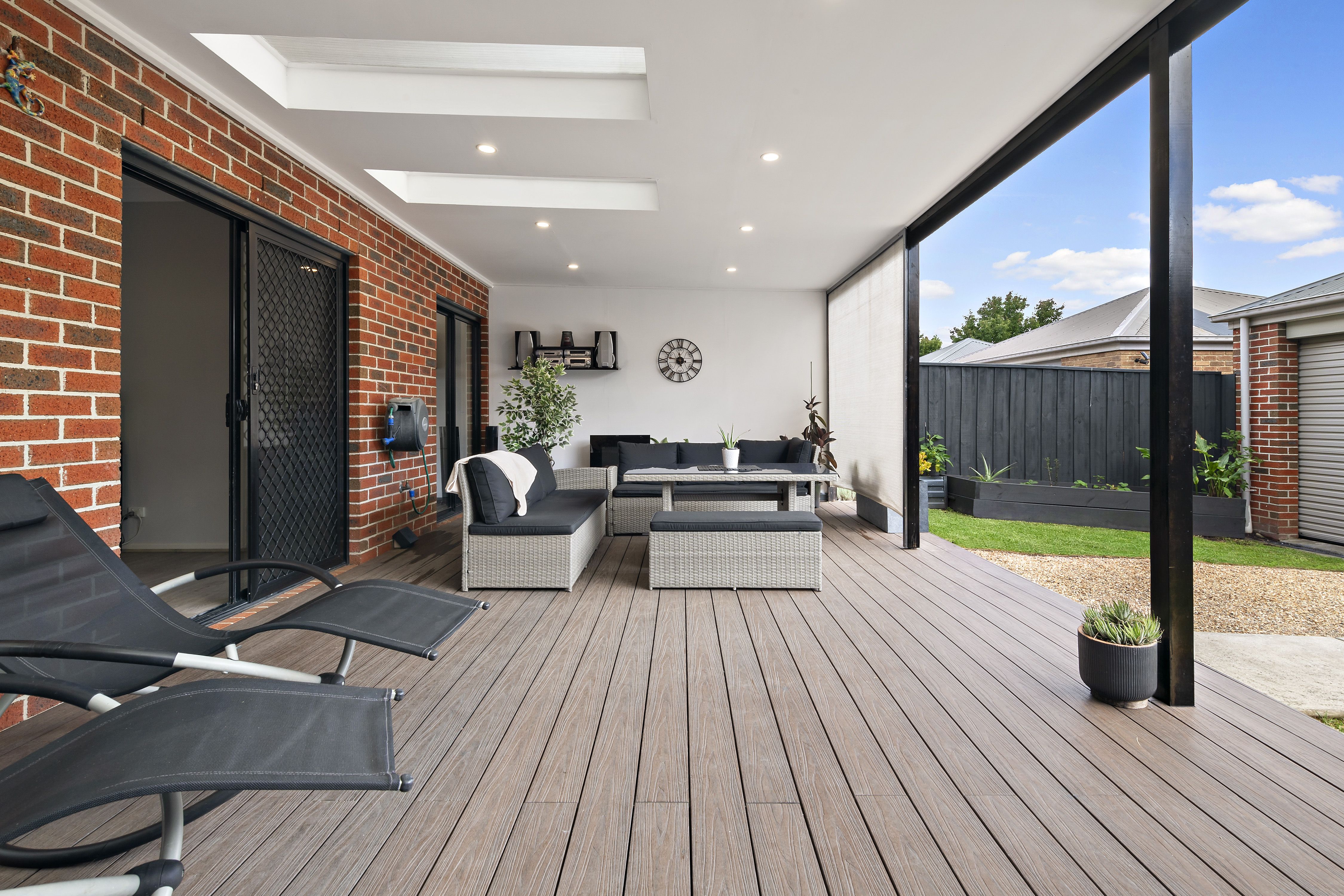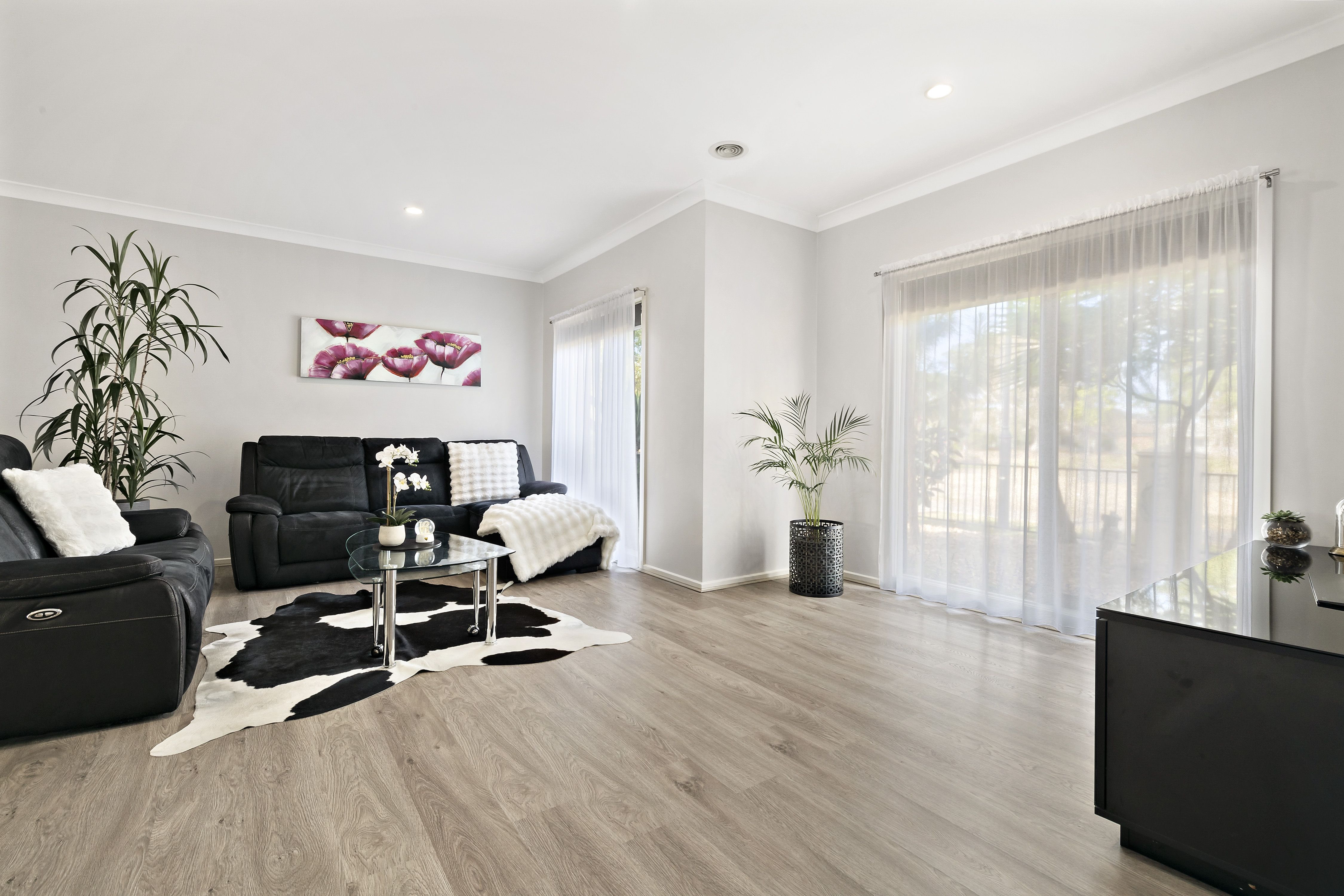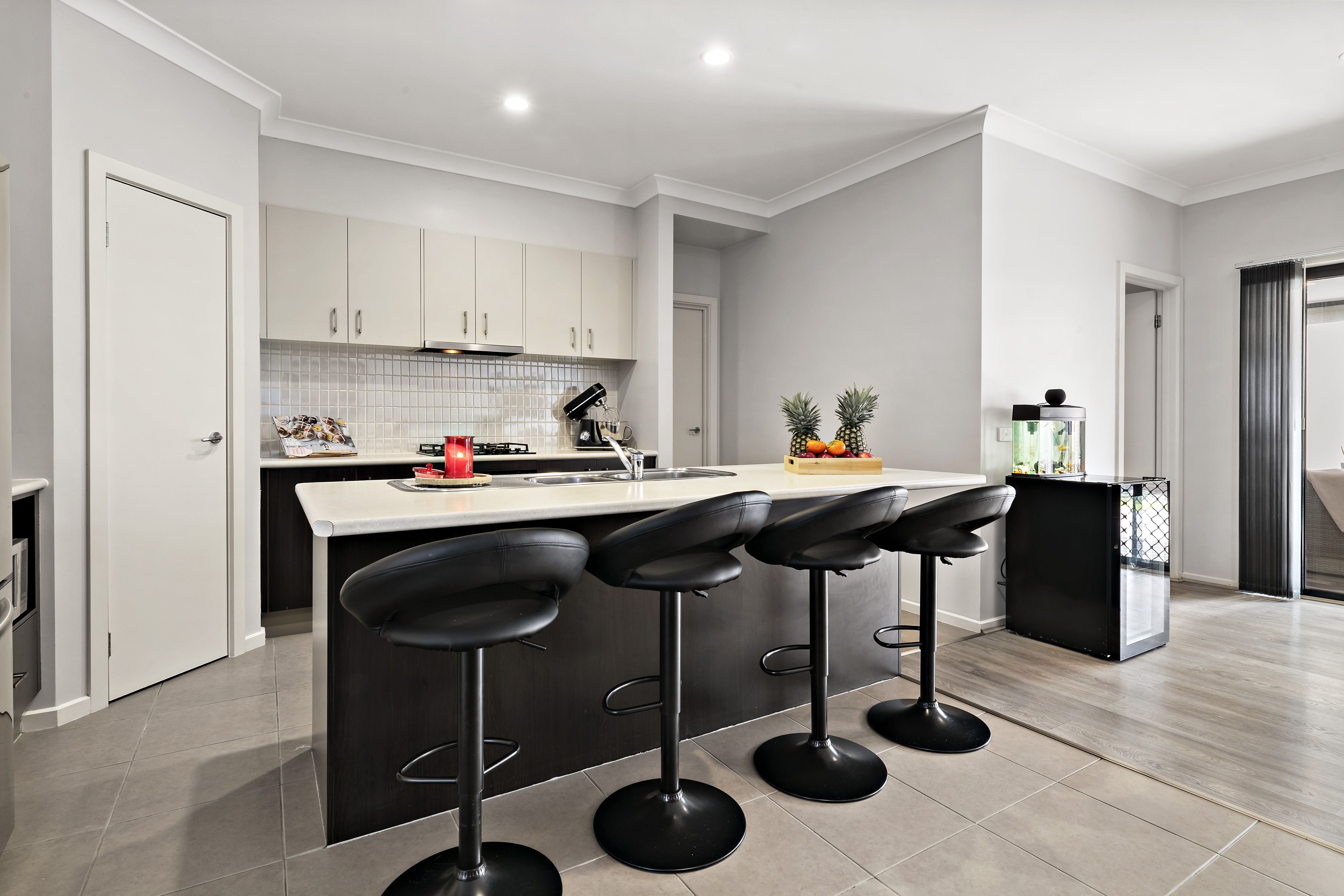 Step inside to the large entry hall, that can also serve as a cozy study nook. Find an expansive open plan living, dining, and kitchen space that showcases contemporary architectural design with each zone flowing effortlessly into the next. The kitchen is complete with s/s appliances, island bench, ample storage, gas cooktop, and dishwasher. Sliding doors lead to a spacious courtyard featuring a paved entertainment area and lawned area, perfect for children and pets to enjoy. The convenience of a downstairs powder room and laundry adds to the functionality of the downstairs space.