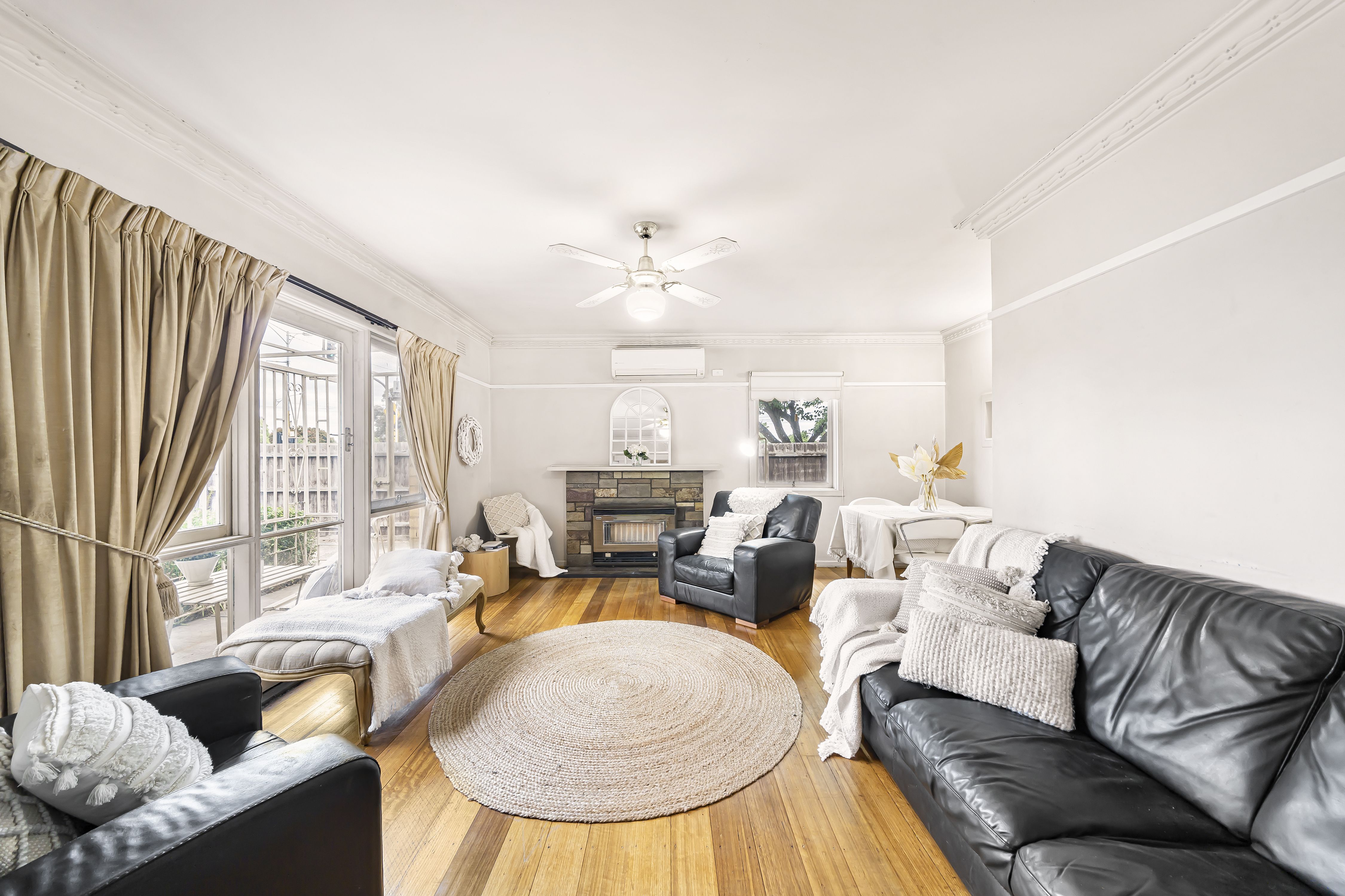 Step inside to a move-in or rent-out ready home. The bright front lounge features a mantel and gas heater, complemented by original hardwood floors that add warmth and character. This flows seamlessly into the meals...
