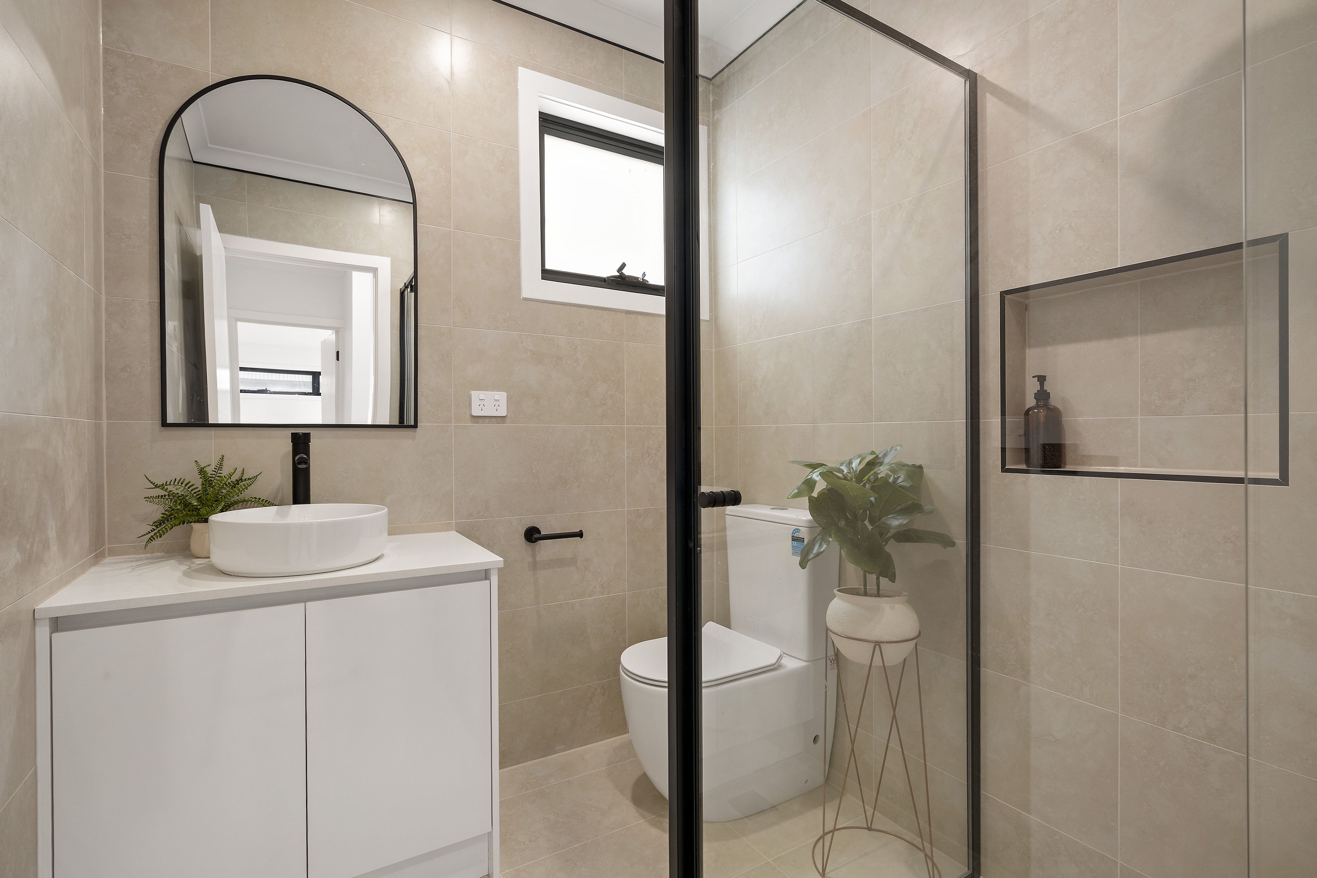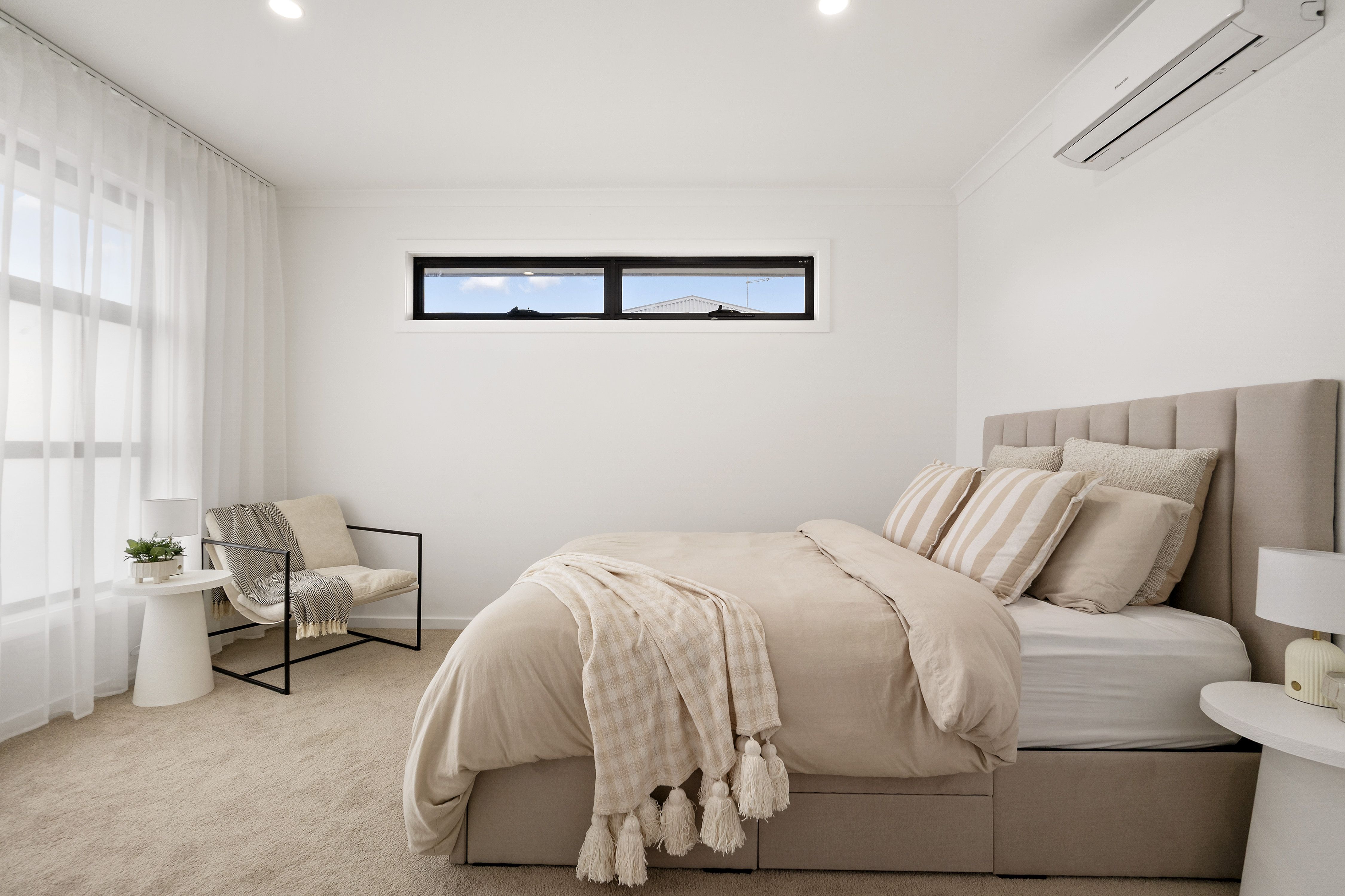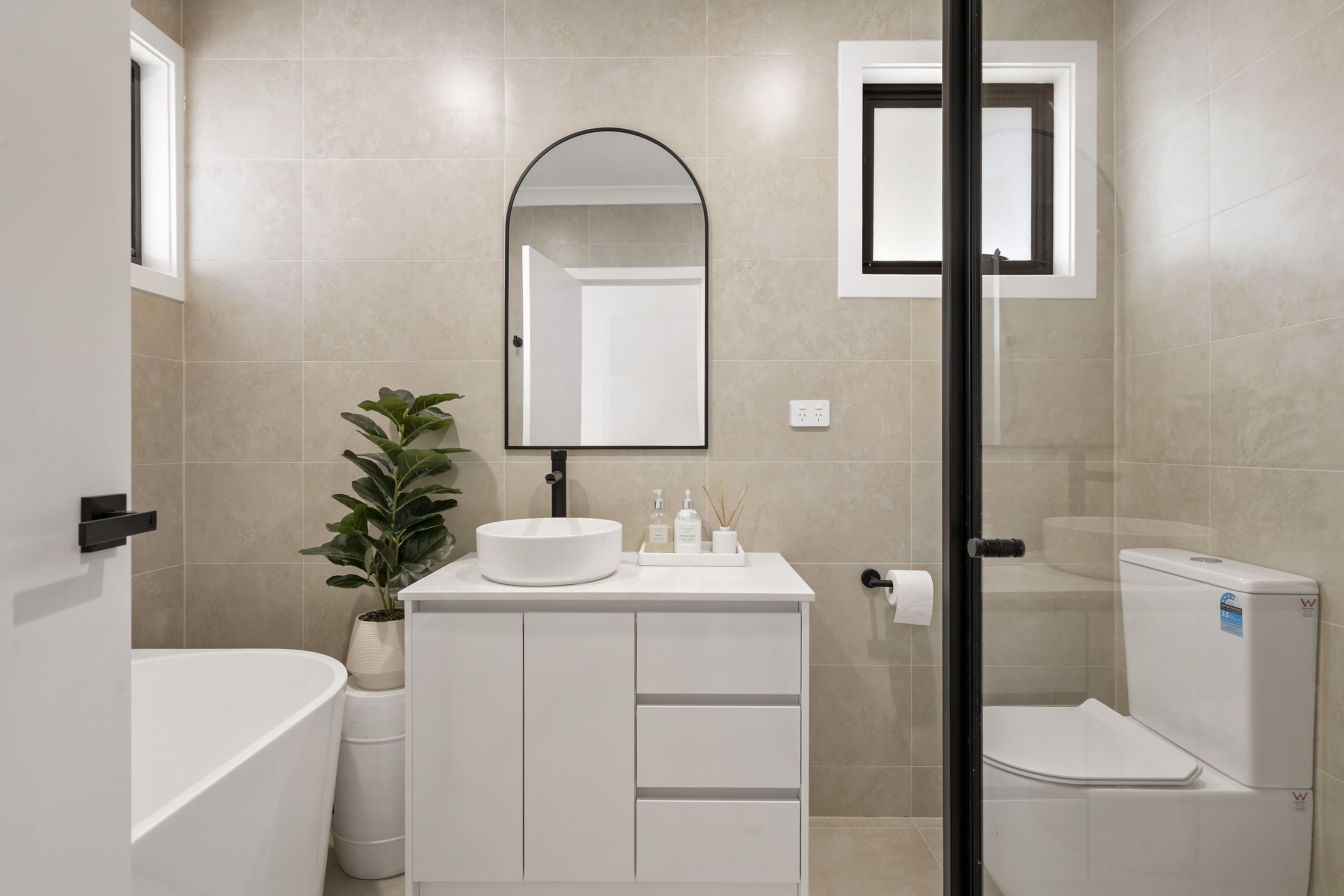 Heading up stairs, find three spacious bedrooms. All bedrooms feature plush carpet, floor to ceiling sheer drapes and robes. The master bedroom also has its very own ensuite complete with shower, toilet and stone top vanity with raised basin and storage. The other two bedrooms are serviced by a main bathroom featuring floor to ceiling tiles, black hardware, sizeable shower, free standing tub, stone top vanity with raised basin and toilet.