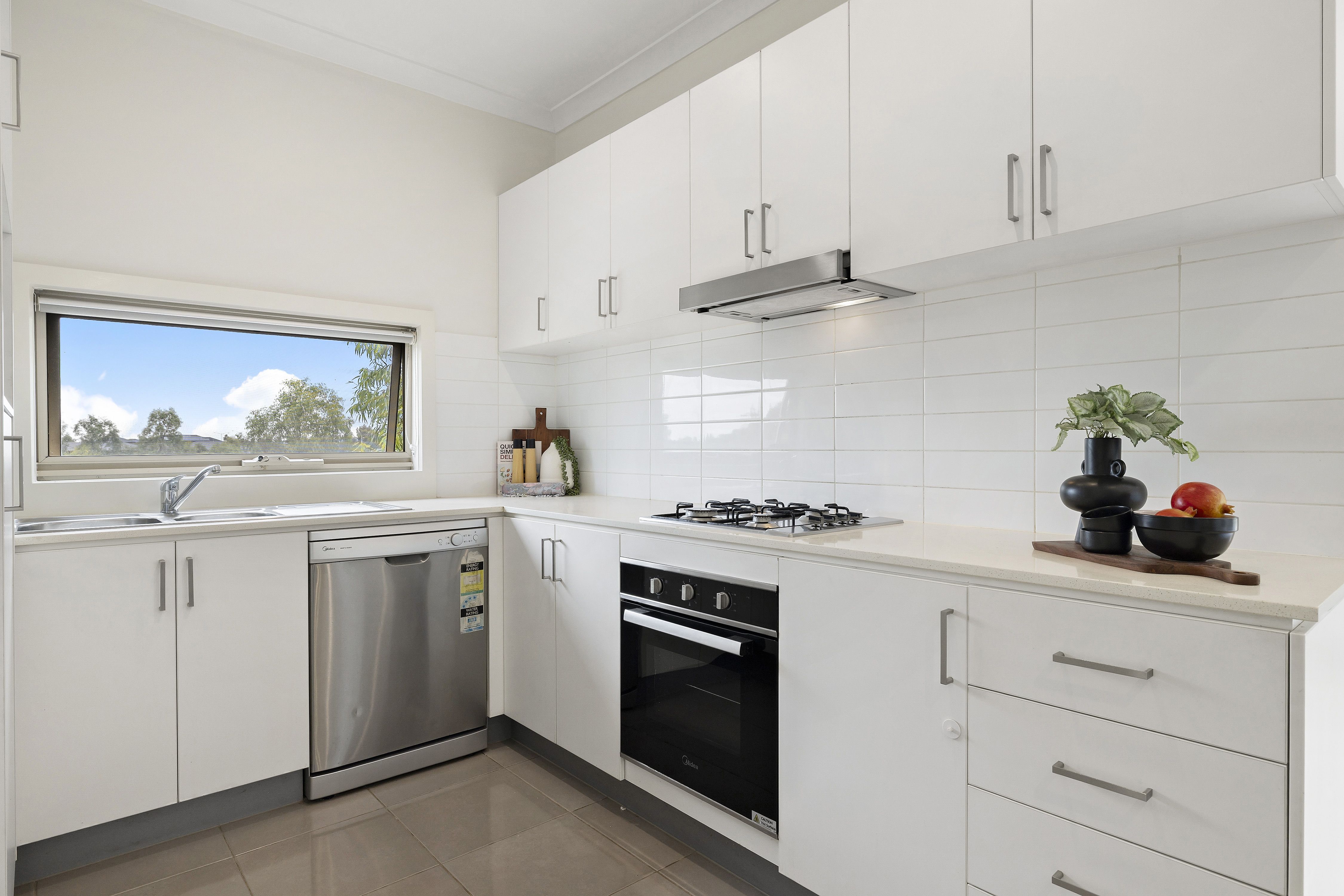 Ascend to the open-plan living area on the first level, where you'll find a beautiful white kitchen with ample storage and sleek stainless steel appliances, including a dishwasher. Enjoy the seamless indoor-outdoor flow with balcony access, ideal for soaking up the sun or enjoying your morning coffee.