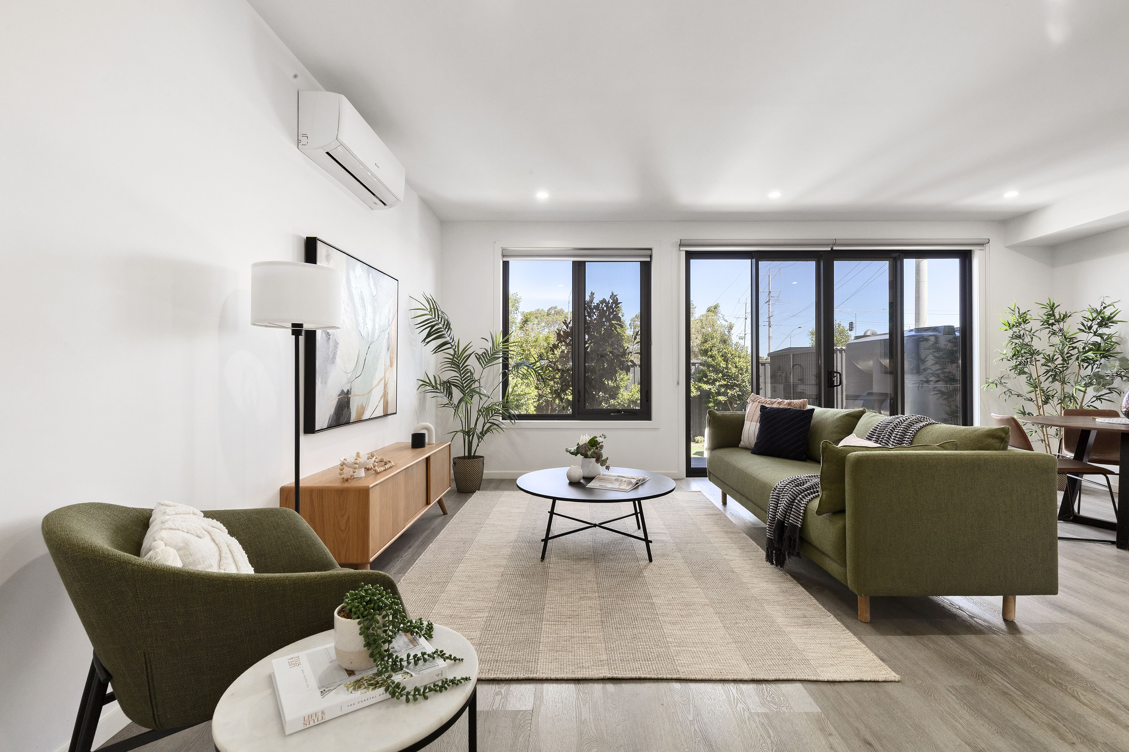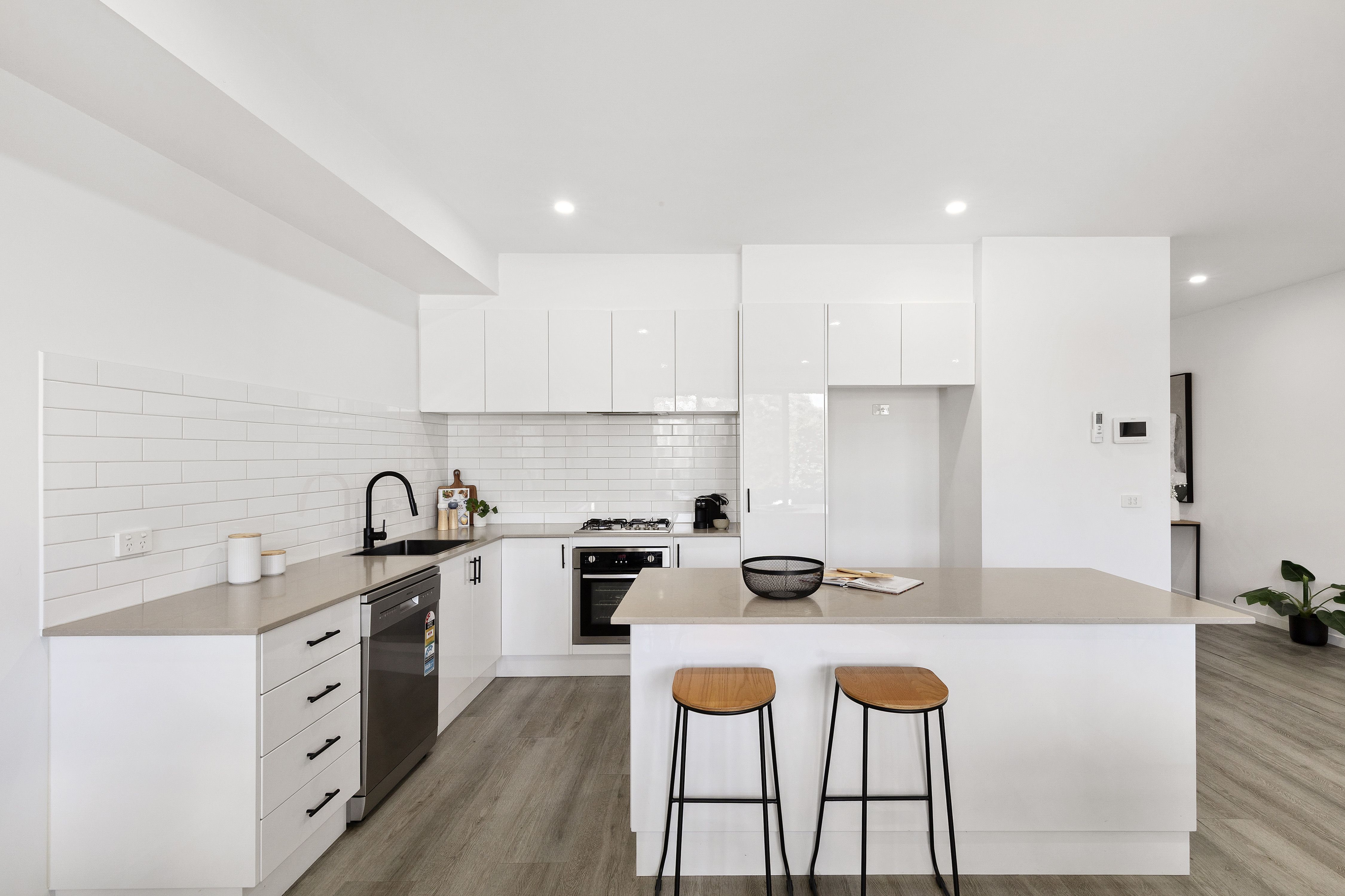 This stylish two‑bedroom townhome greets you with a wide entrance hallway that leads through a flowing, open-plan living and zoning area. High ceilings and abundant natural light create a generous, uplifting atmosphere throughout the home, while zoning provides practical separation between living and sleeping areas for everyday comfort and privacy.
