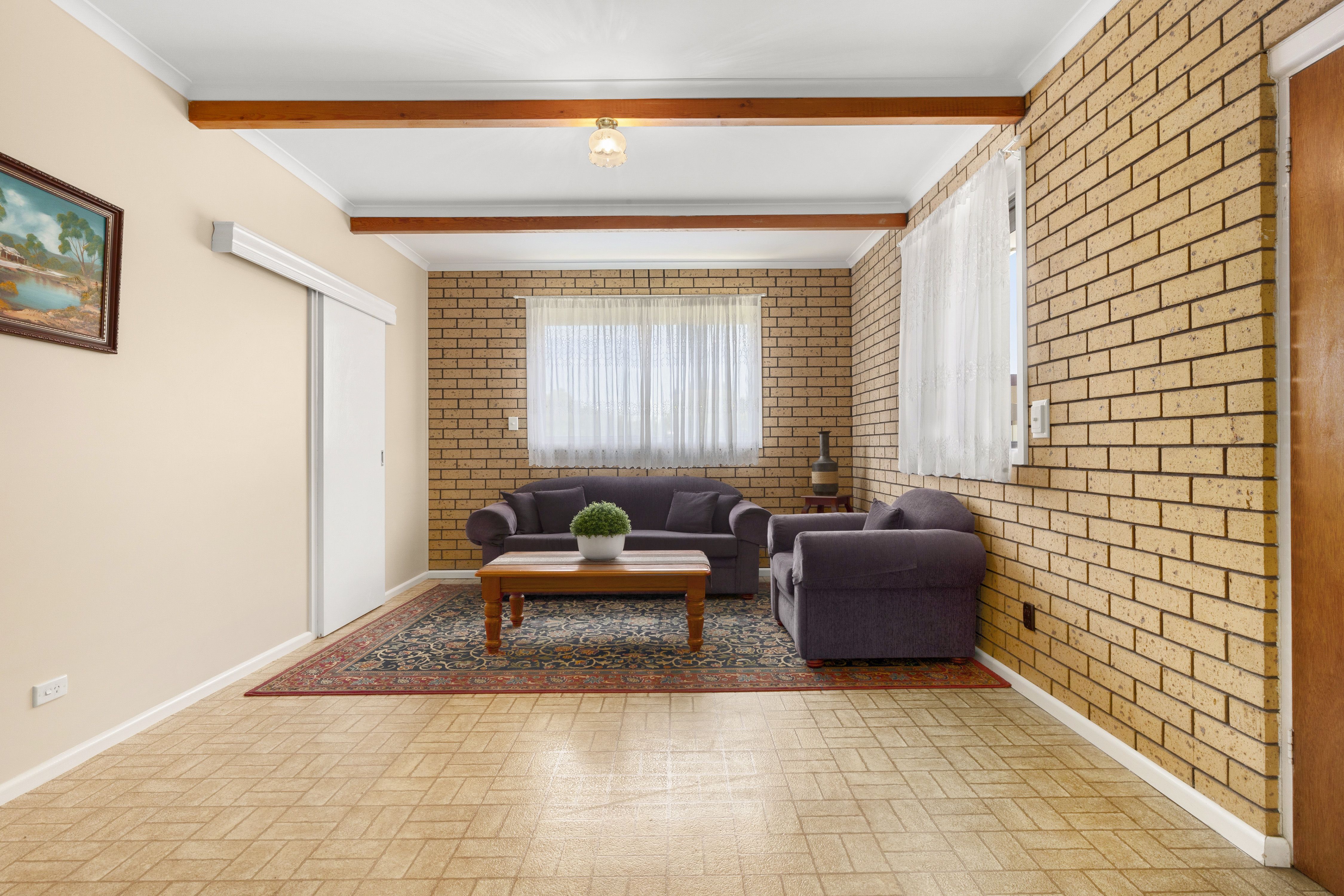 At the end of the hallway you will be delighted by the expansive open plan living area, with U- shaped kitchen including ample storage, double oven and gas cooktop. Sliding doors lead you to light filled lounge area featuring wooden ceiling beams, this room also includes access to the rear yard.