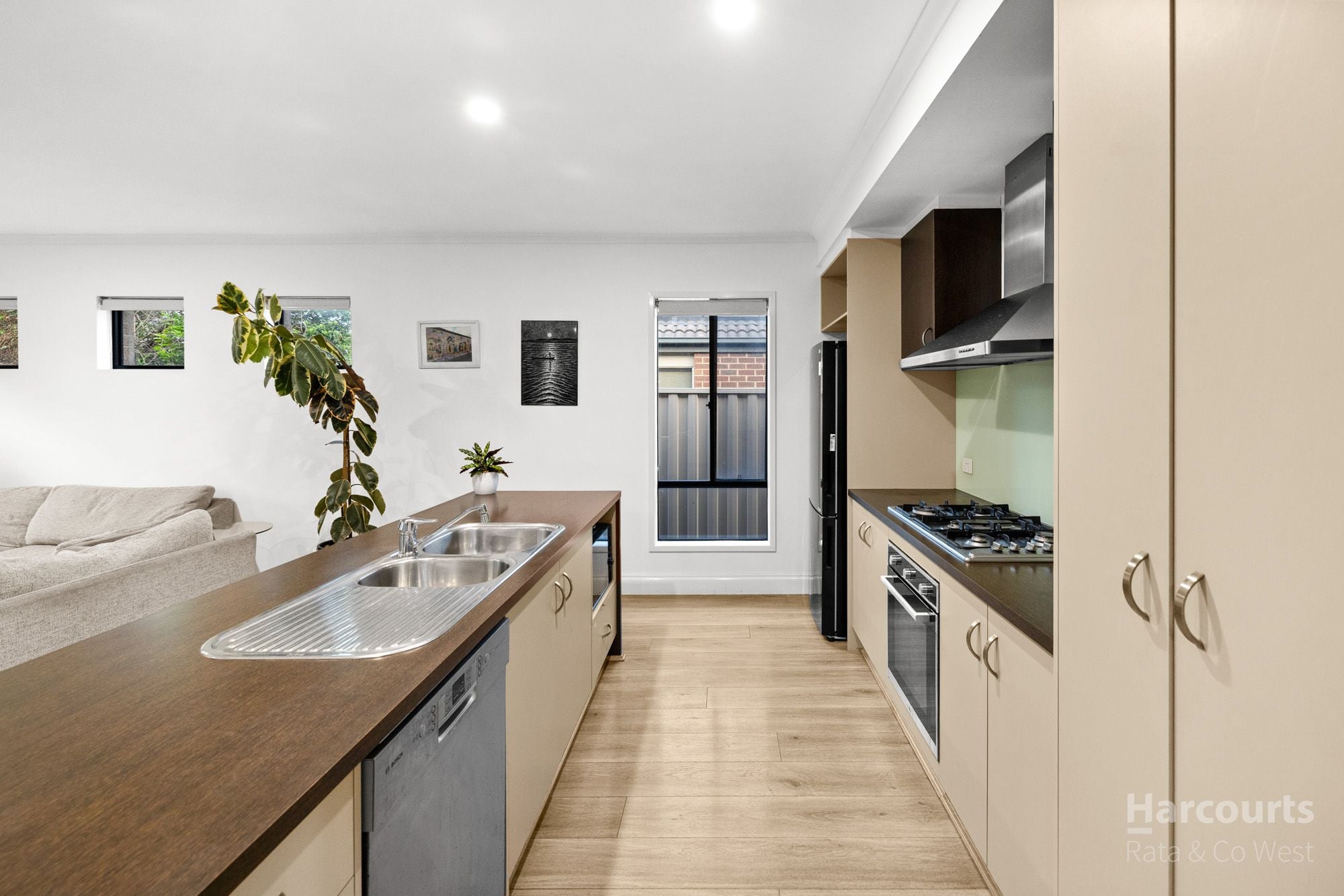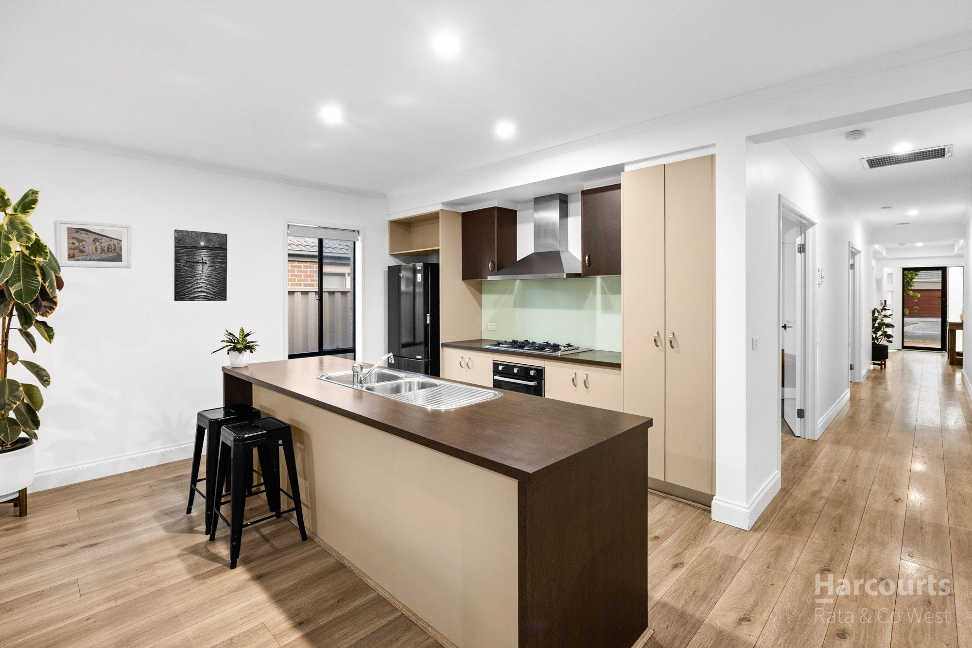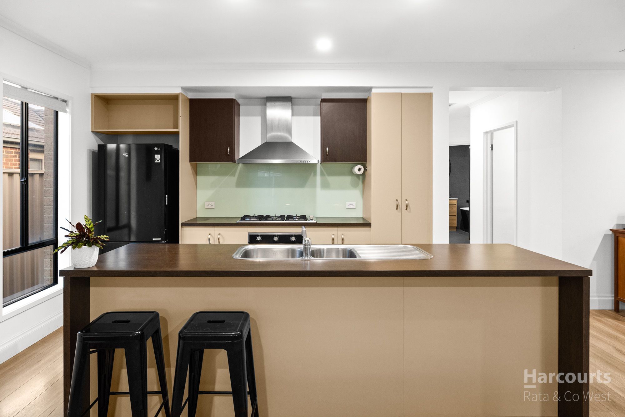 At the heart of the home, the modern kitchen is equipped with stainless steel appliances including an oven, gas hotplates, rangehood and striking glass splashback, overlooking the open-plan meals and living area enhanced by stylish floorboards, creating a warm and contemporary feel throughout.