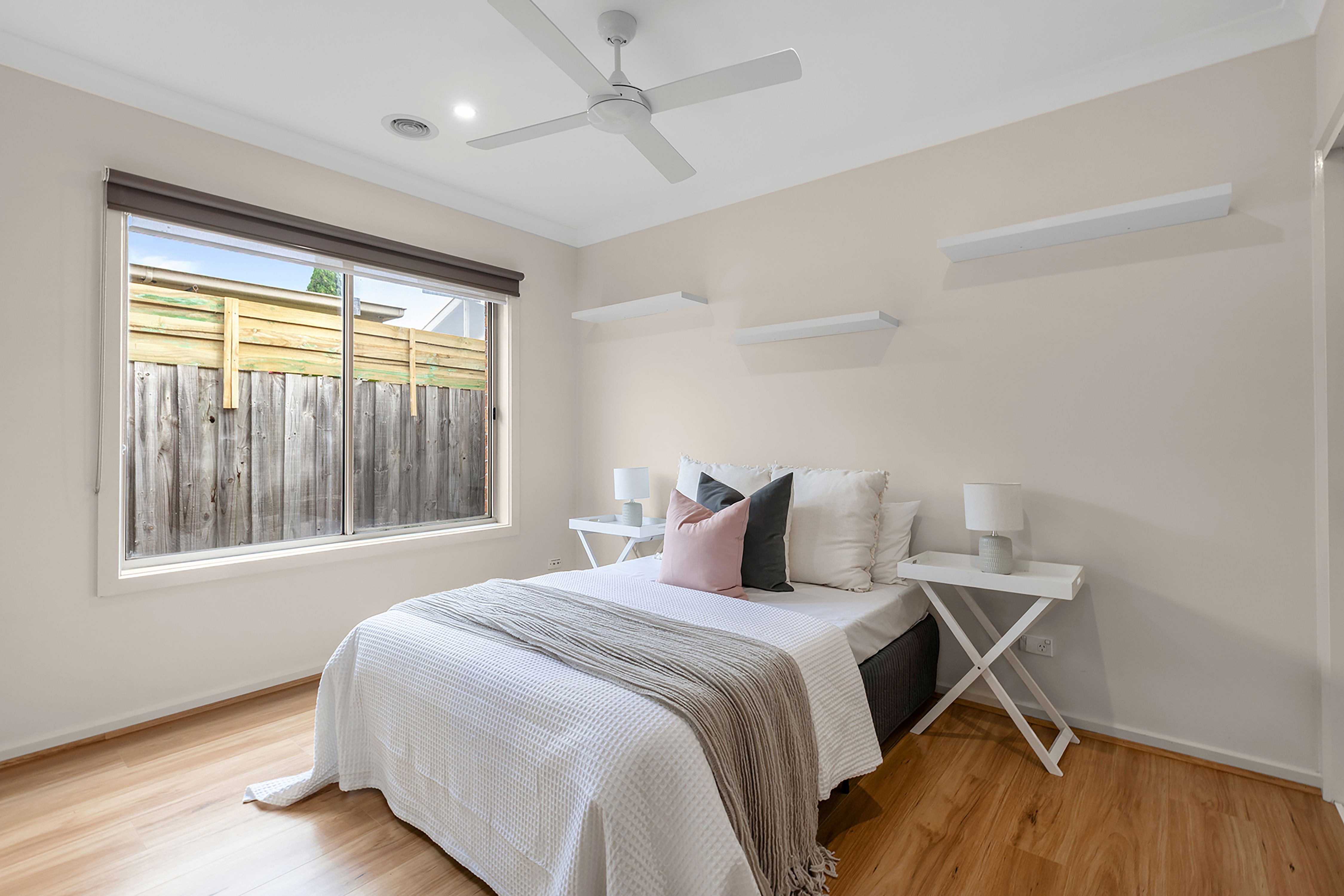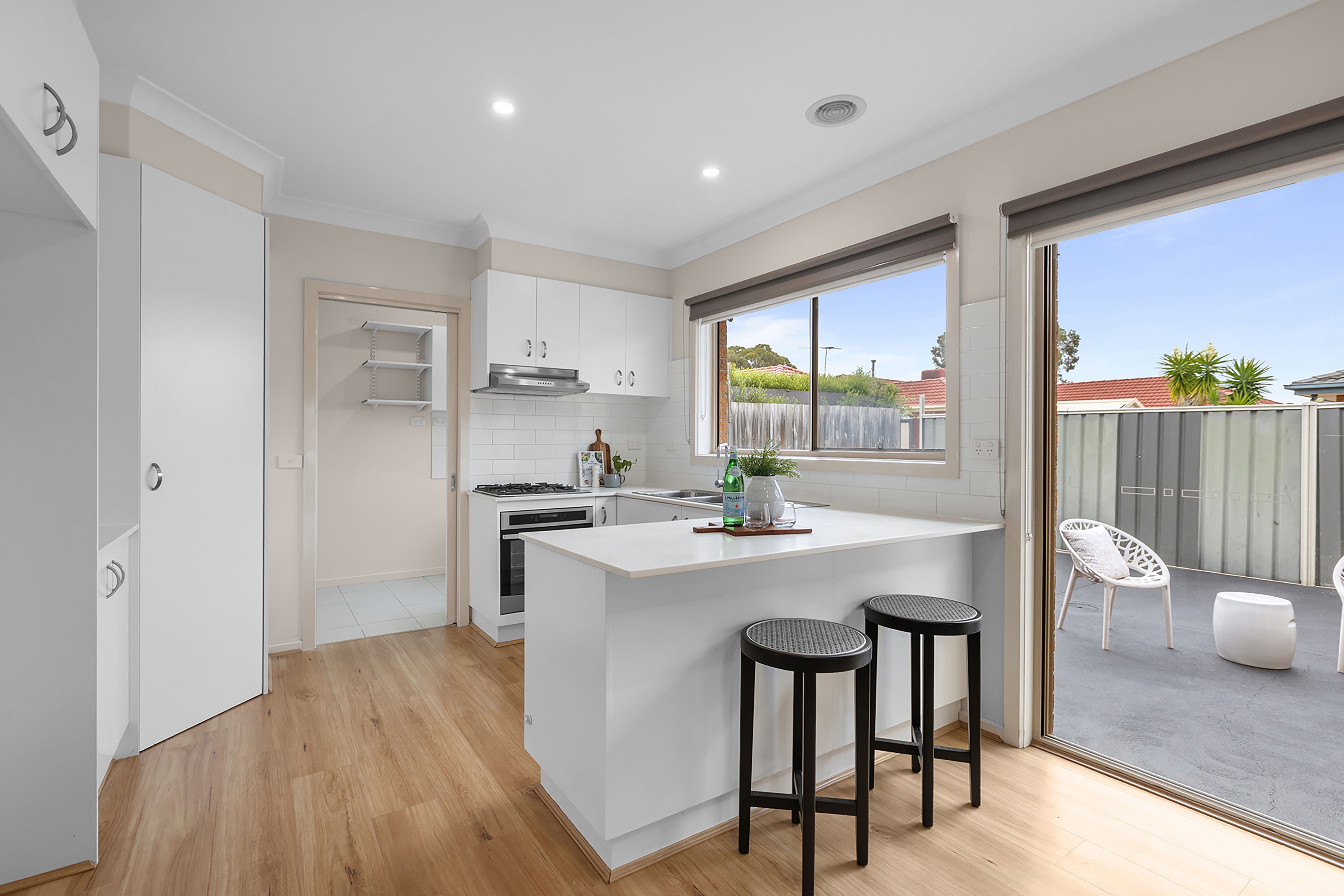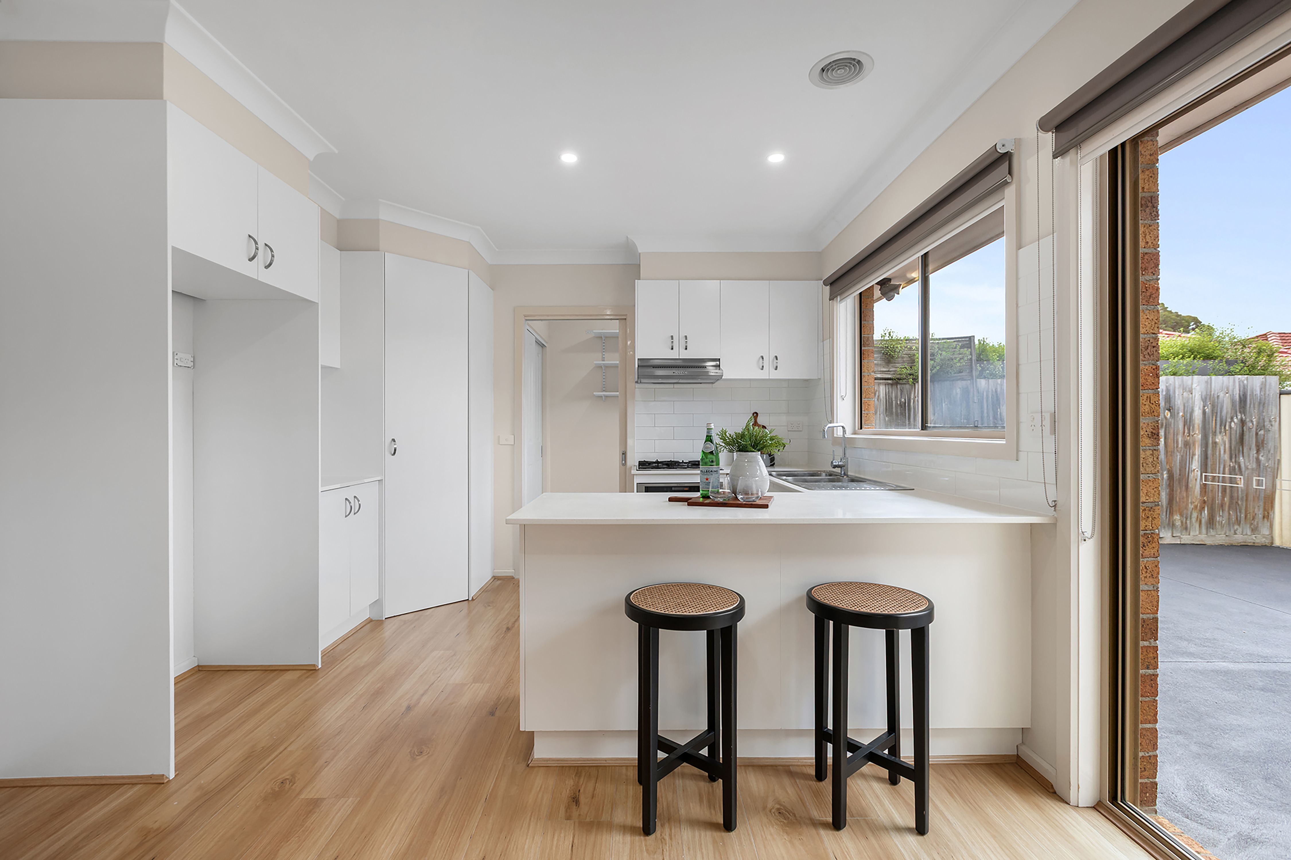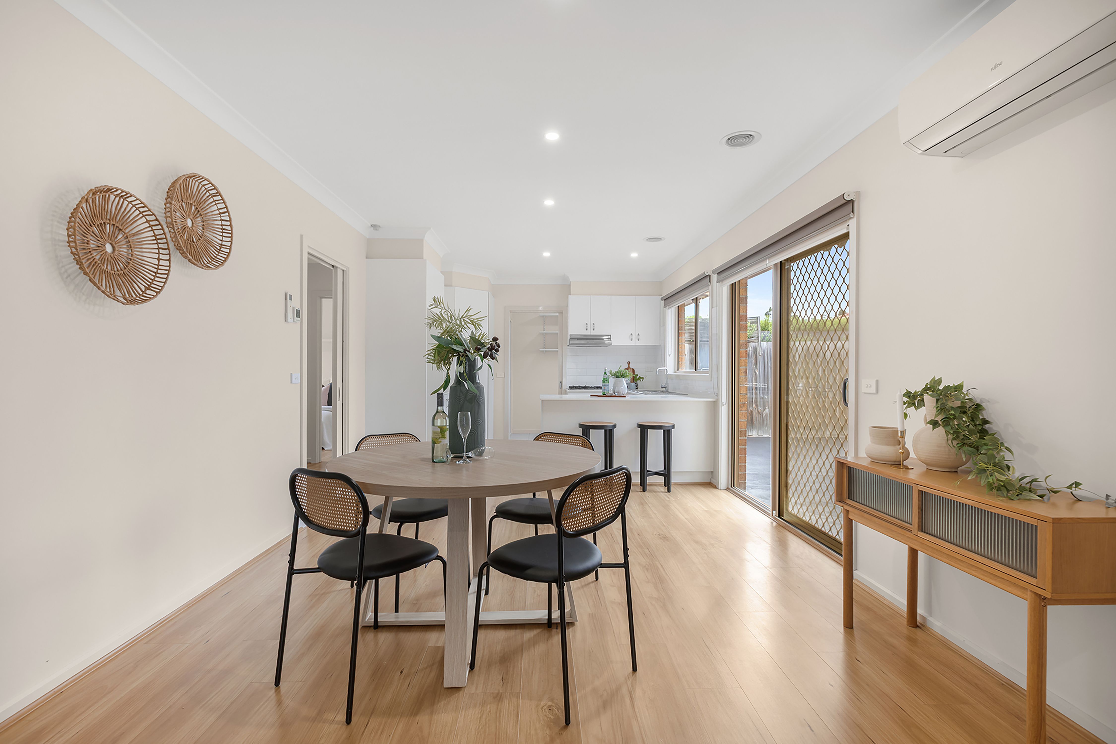 The home comprises three generous bedrooms, including a master suite complete with a walk-in robe and en-suite, while the remaining two bedrooms feature built-in robes. A light-filled open-plan living and dining area is enhanced by stylish floating floorboards, flowing seamlessly into a well-appointed kitchen boasting stone bench tops, ample cupboard space and stainless steel gas appliances.
