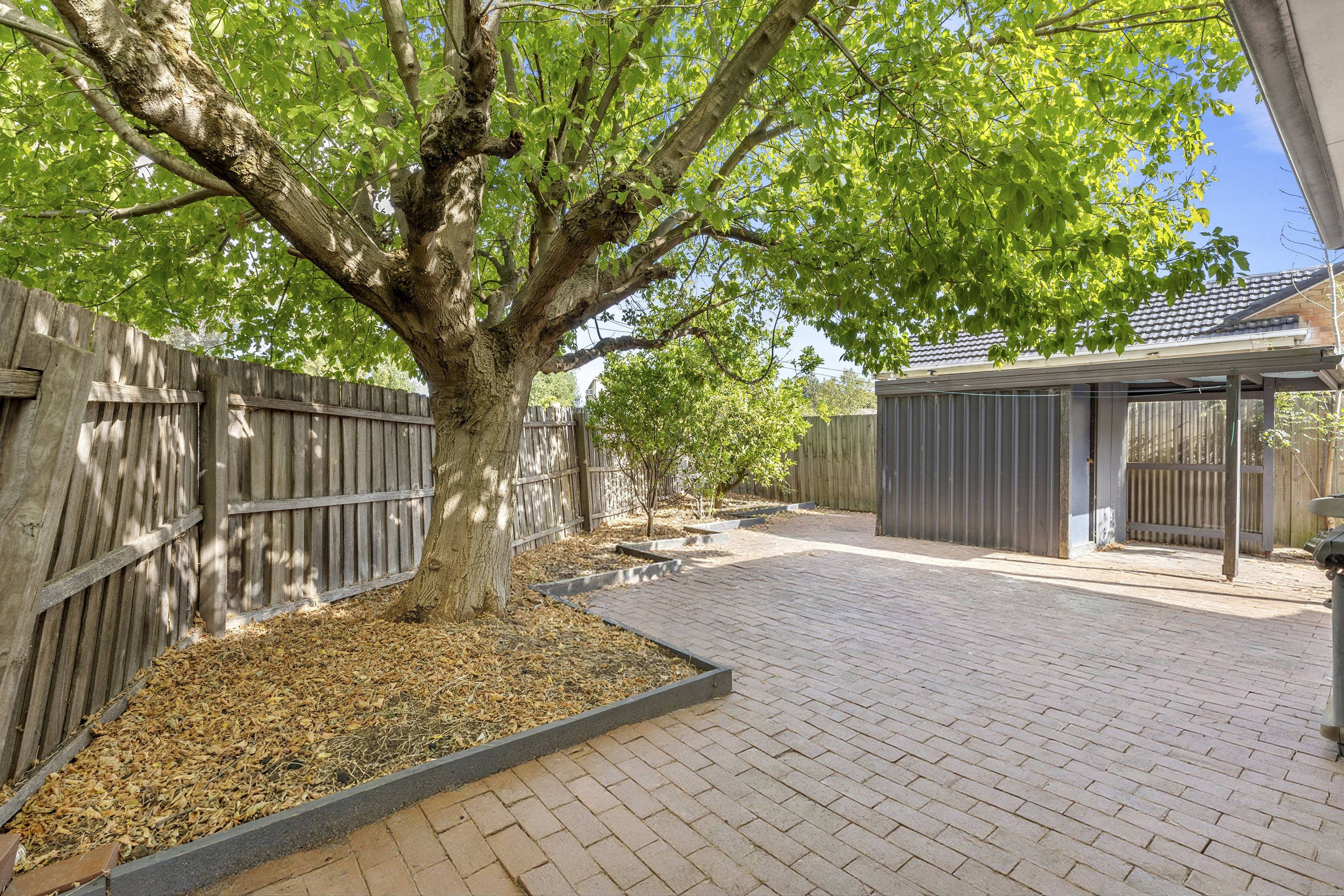 Step outside to a low-maintenance yard with the added bonus of a shed for extra storage, tools, or weekend projects.