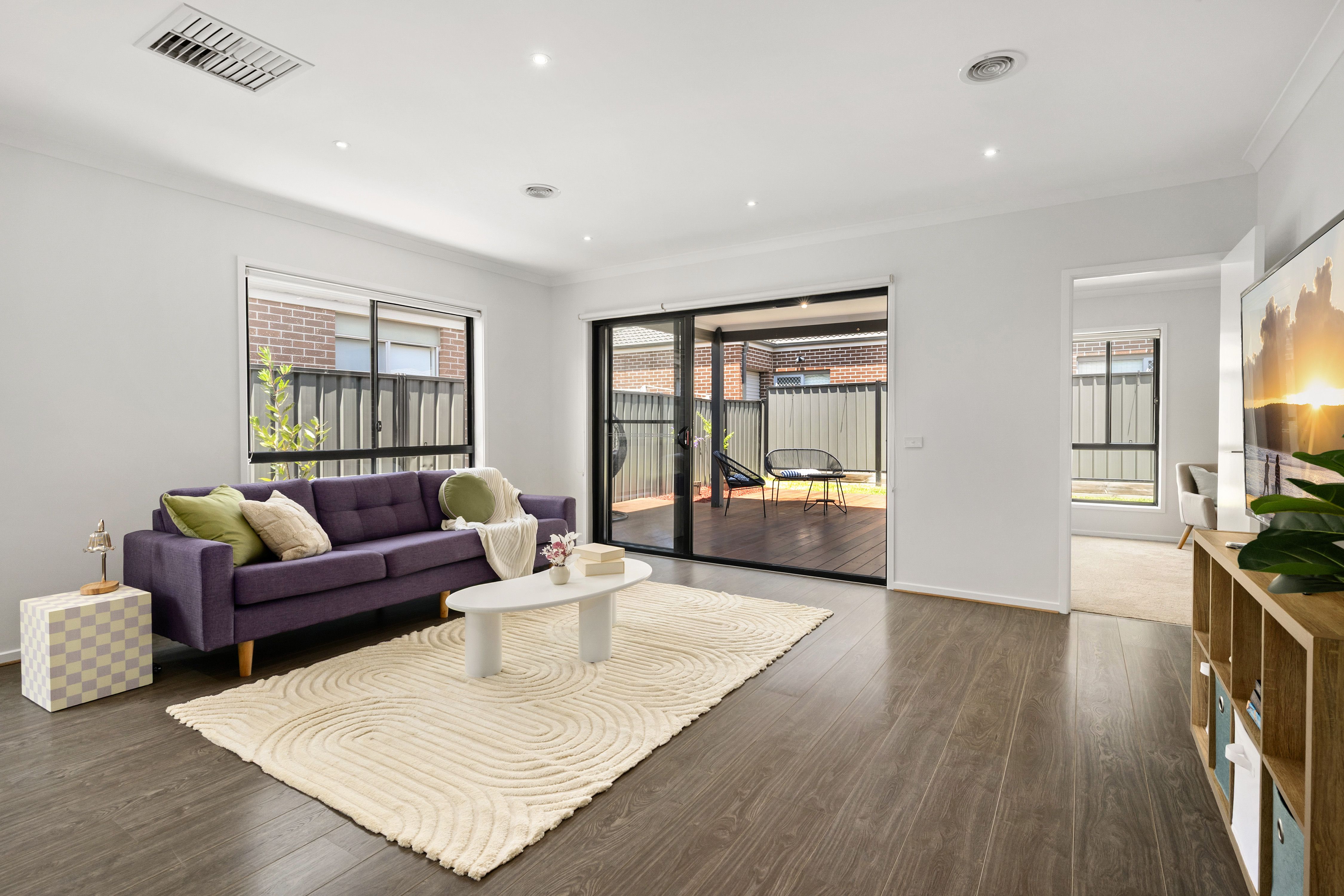 At the heart of the home is a well appointed kitchen complete with Caesar stone benches, glass splash back, ample storage and stainless steel Westinghouse appliances. The kitchen is accompanied by an open plan meals and living zone overlooking a covered alfresco and large deck. Ample backyard complete with tidy garden beds and fire pit area with timber seating.