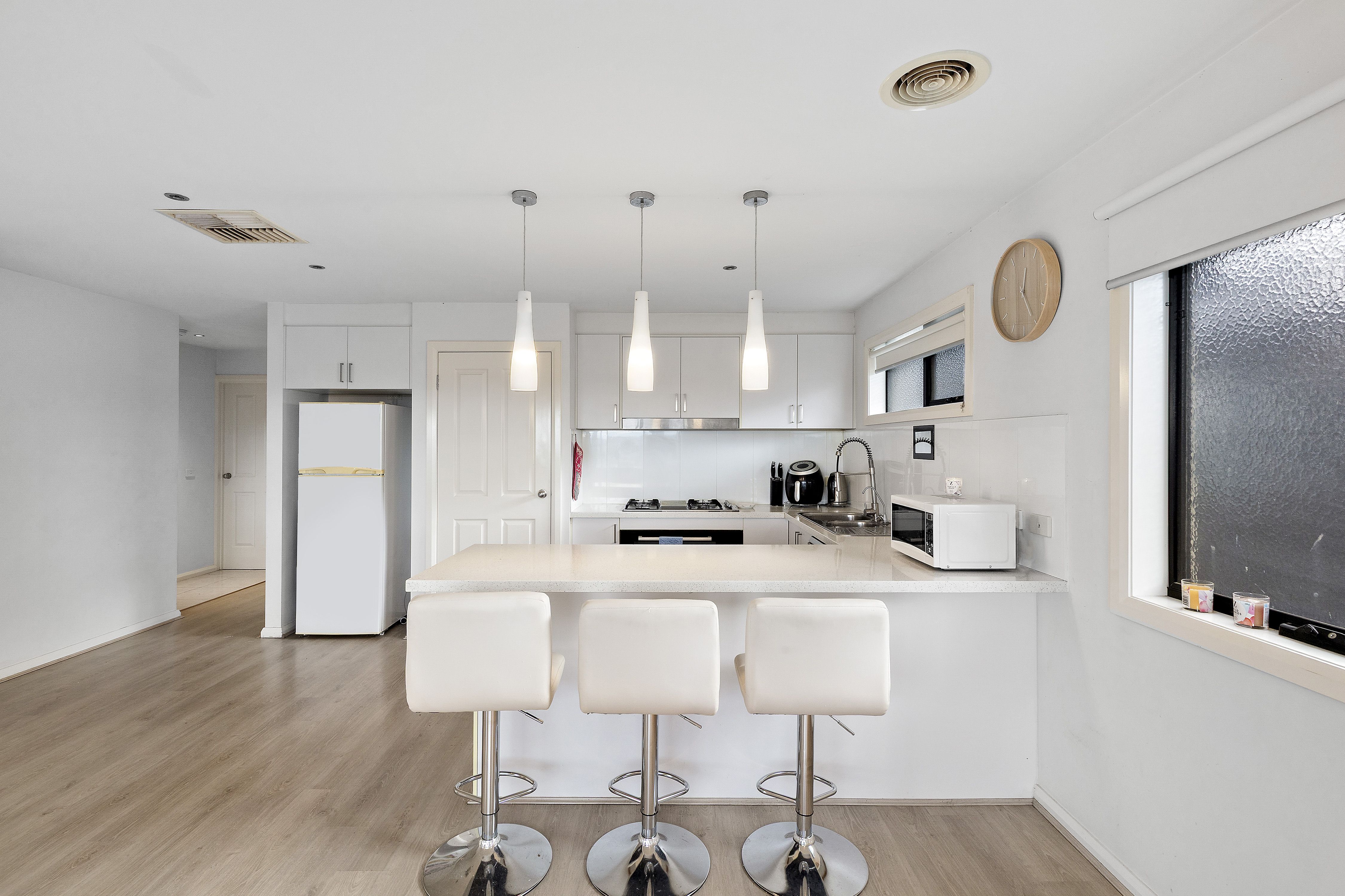 The sleek kitchen is ready for any culinary challenge, equipped with stainless steel appliances, gas cooking, a dishwasher, and plentiful storage. Ducted heating and evaporative cooling keep you comfortable all year round, while the double garage provides secure internal access.