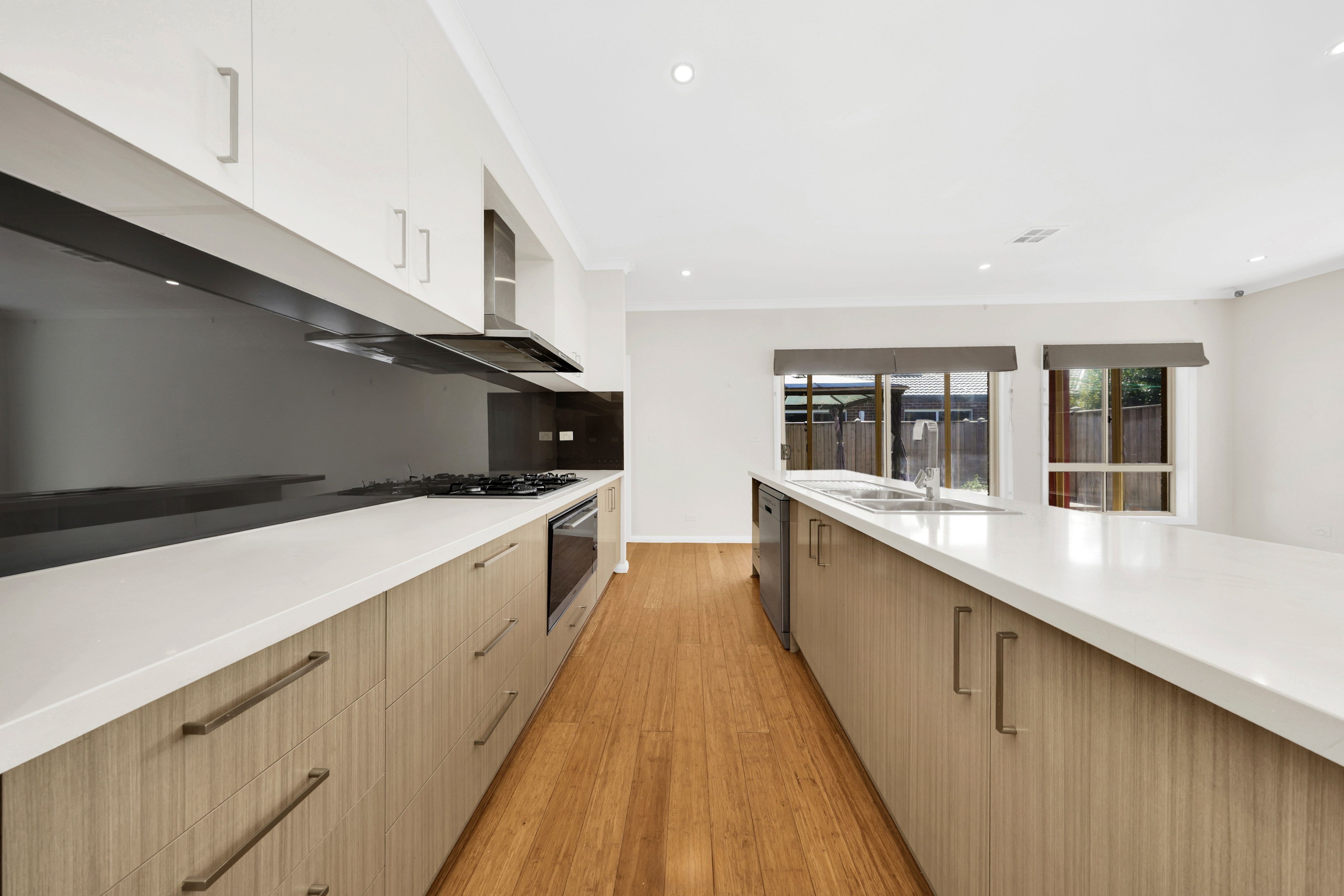 Inside, light-filled interiors feature premium Bomba flooring, soft neutral tones, and a seamless open-plan layout, creating inviting living and dining spaces perfect for family life or entertaining.