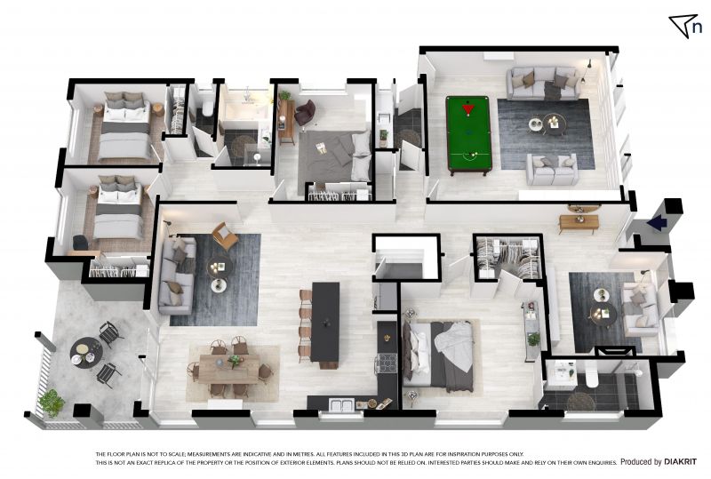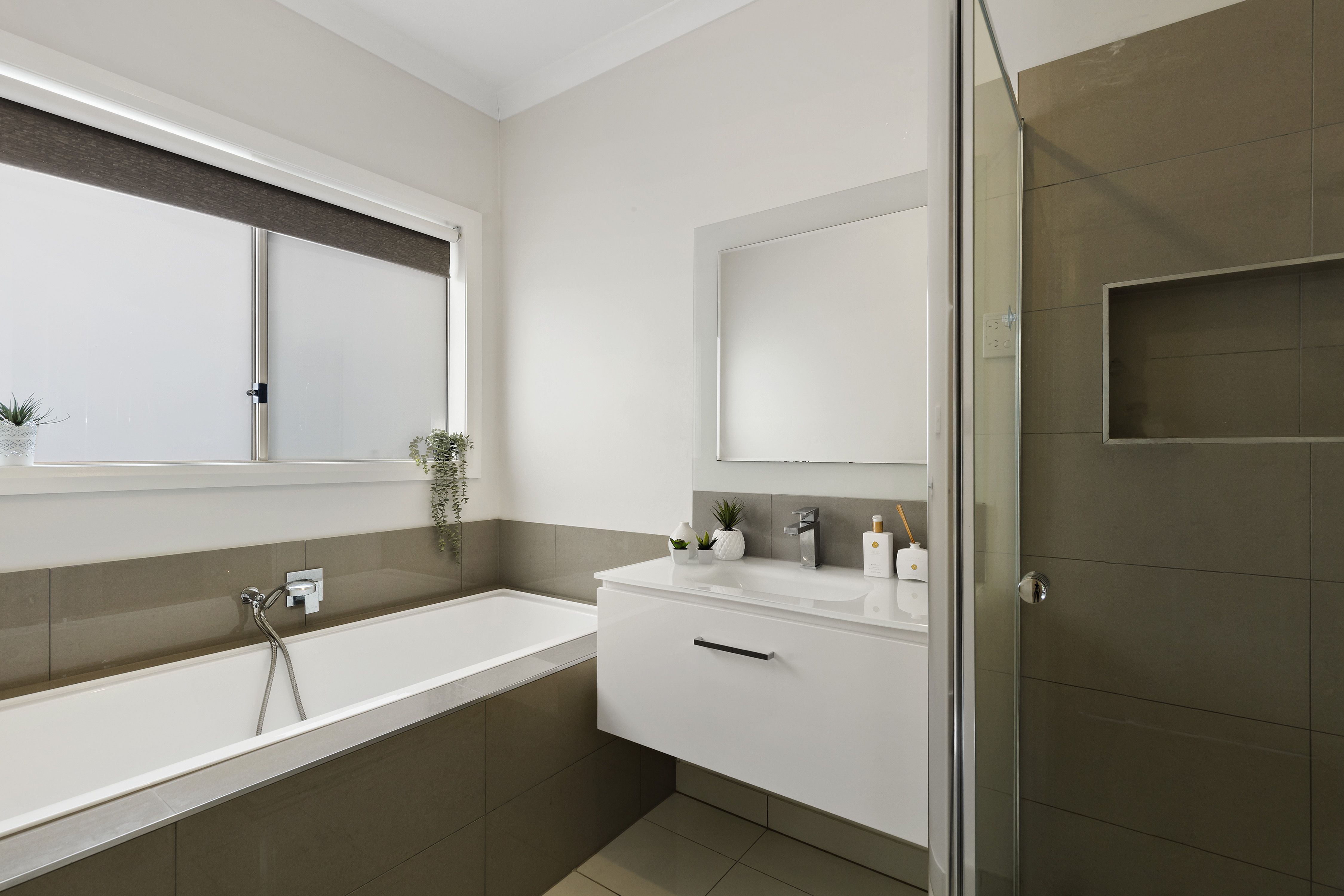 The spacious main bedroom features a walk-in wardrobe and private ensuite, while three additional bedrooms each include built-in robes and are serviced by a sleek central bathroom with separate bathtub and shower.